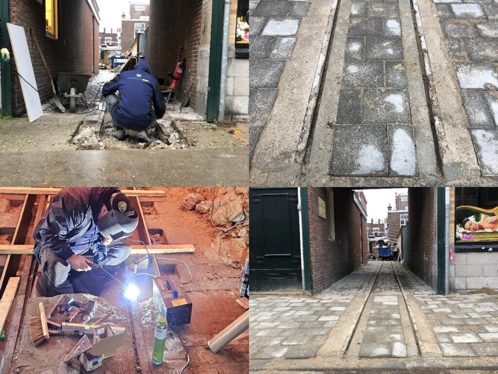 Sinds 1972 lopen er rails vanaf de werf van Hoogendoorn Bouw naar de straatkant. Het smalspoor doet al meer dan 50 jaar dienst voor het vervoer van puincontainers. Afgelopen week is het laatste stukje na de poort opnieuw gelast nadat de gemeente het trottoir had laten vernieuwen.